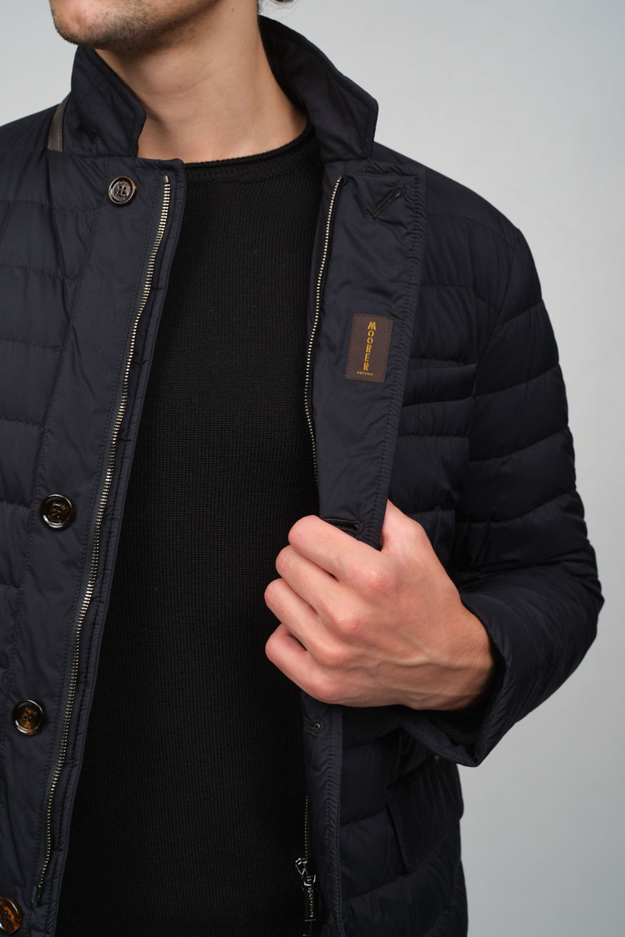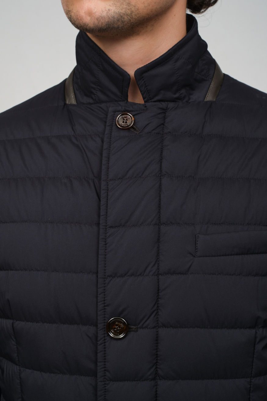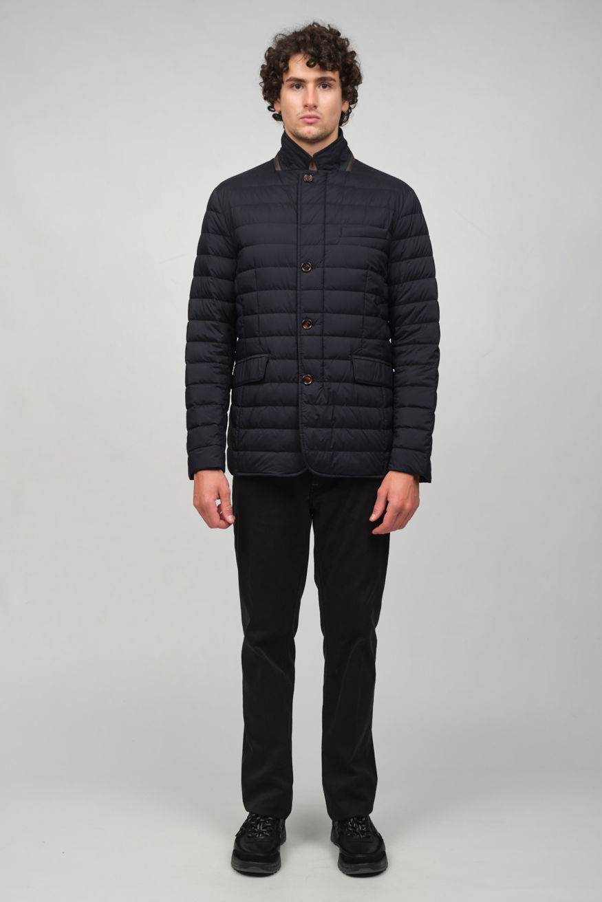 Синяя стеганая куртка MOORER пиджачного кроя сочетает влагостойкую ткань с натуральным пуховым наполнителем, обеспечивающим комфорт при температуре от 0 до 15⁰С благодаря равномерному распределению утеплителя.