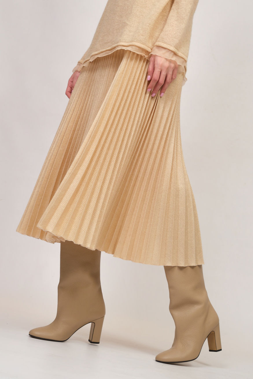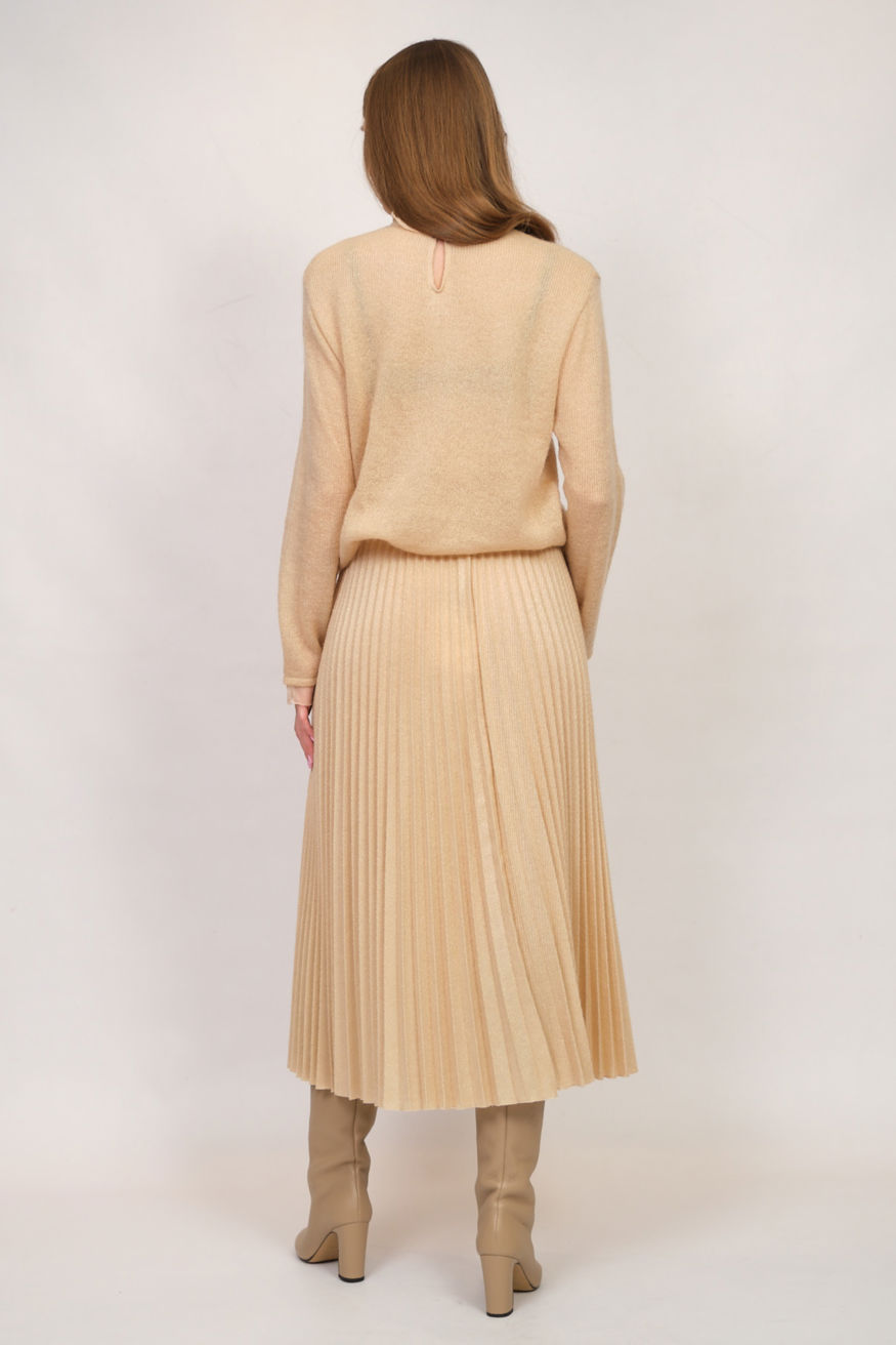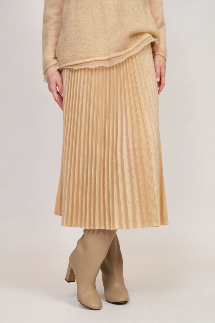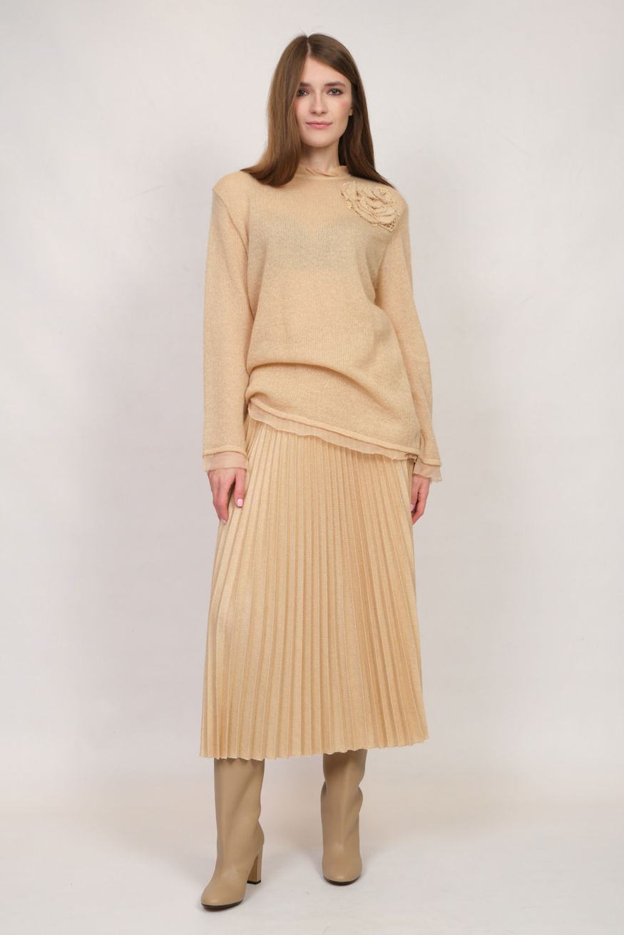 Элегантный комплект из нежного плотного трикотажа бежевого цвета. В состав пряжи вошли мягкая акриловая шерсть, пушистый мохер и прочный полиамид, за счет которого изделие тянется, но не вытягивается.