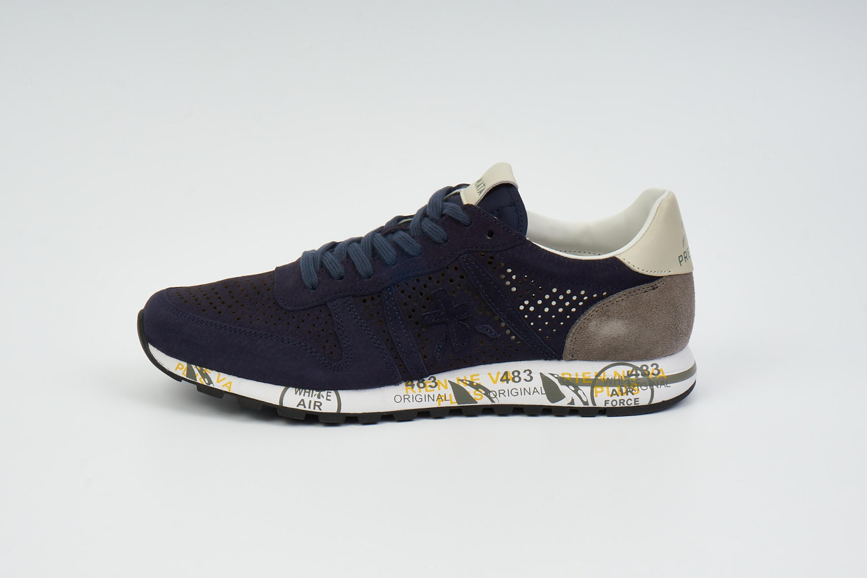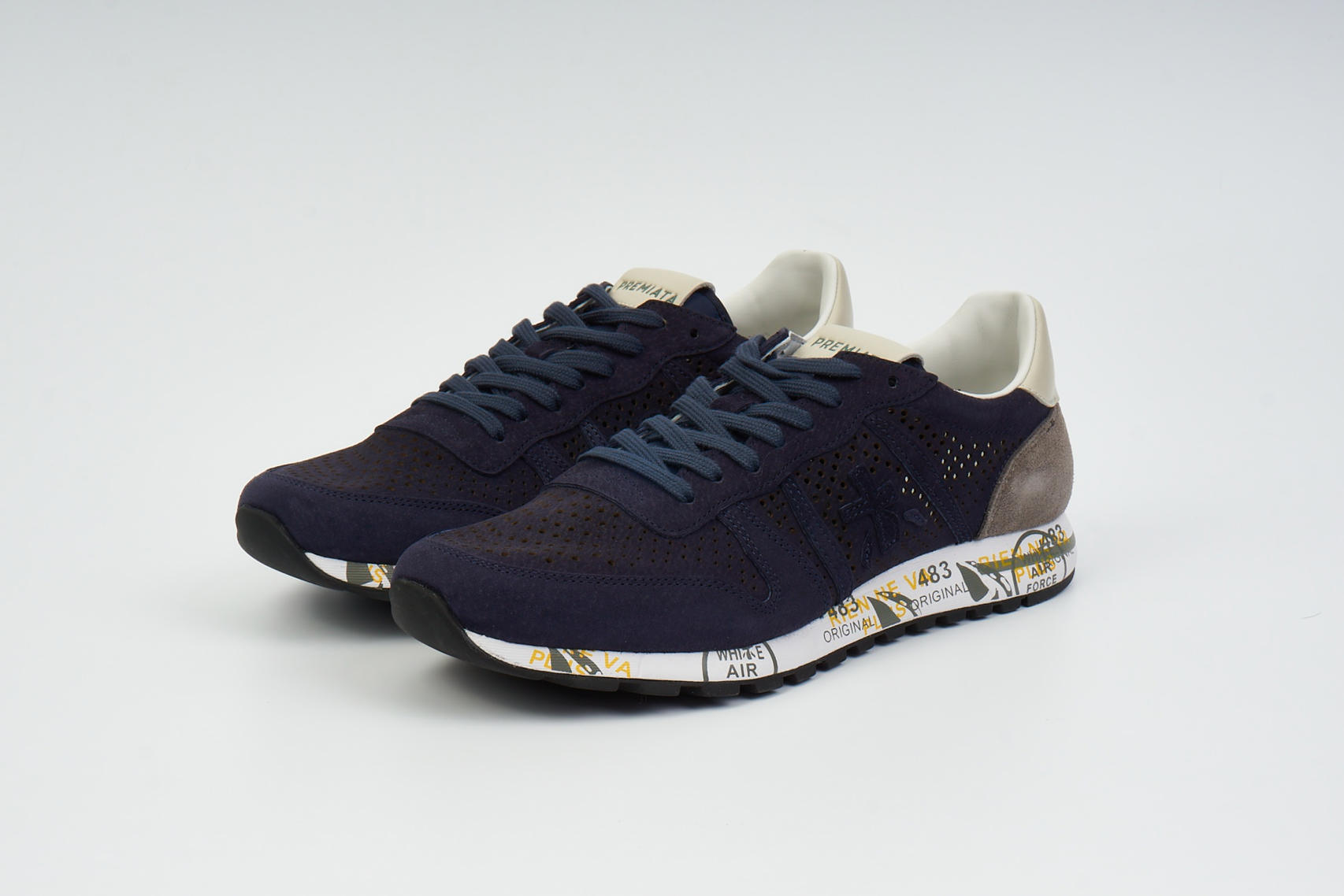 Темно-синие кроссовки Premiata, выполненные из натуральной замши, с декоративной сквозной перфорацией, обеспечивающей комфорт в жаркую погоду, с кожаной подкладкой и стелькой, на гибкой резиновой подошве, с фирменной нашивкой и контрастными деталями, идеально сочетающиеся с джинсами и шортами, для создания стильных повседневных образов, премиальное качество материалов, универсальный дизайн