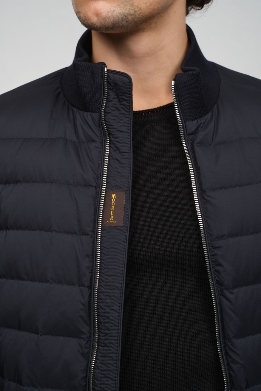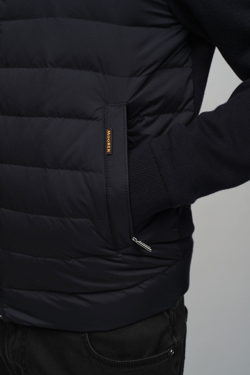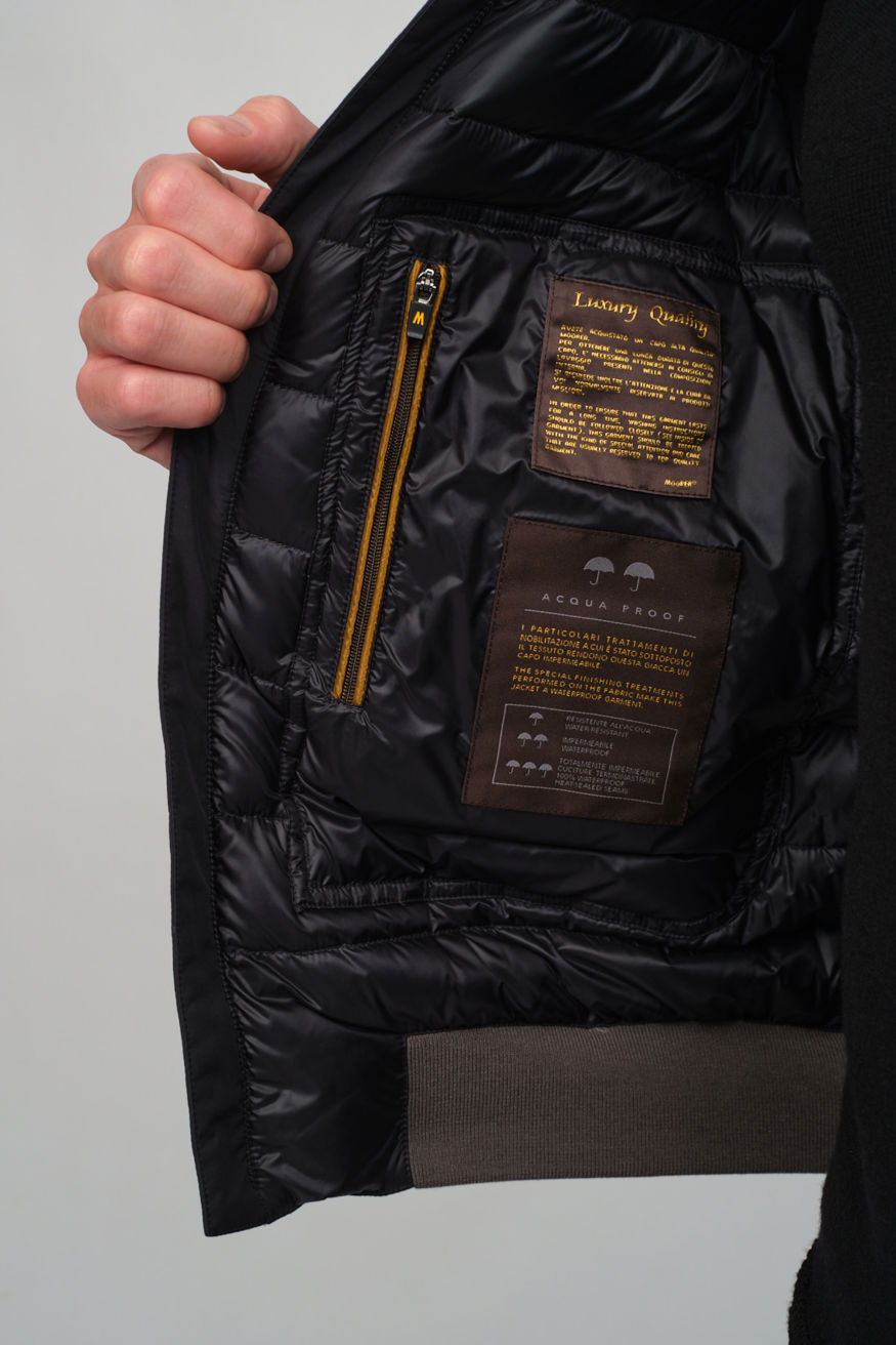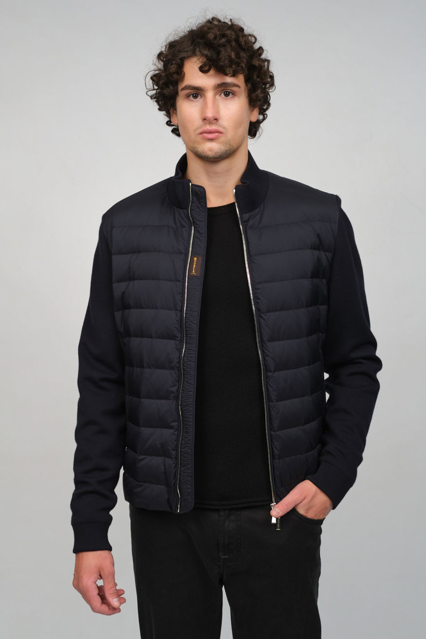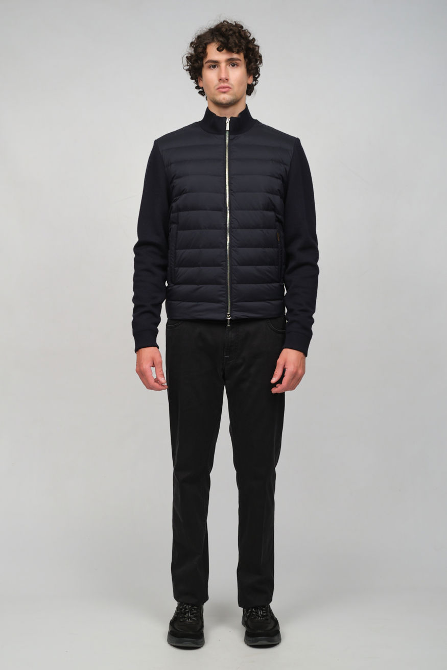 Черная стеганая куртка с технологичным подходом. Водоотталкивающая прорезиненная ткань надежно защищает от ветра и дождя. Дизайн с высоким воротником и рукавами из плотного трикотажа создает иллюзию стильного многослойного образа — как будто жилет надет поверх свитера. Легкий пуховый наполнитель премиального качества обеспечивает комфортное тепло, не утяжеляя.