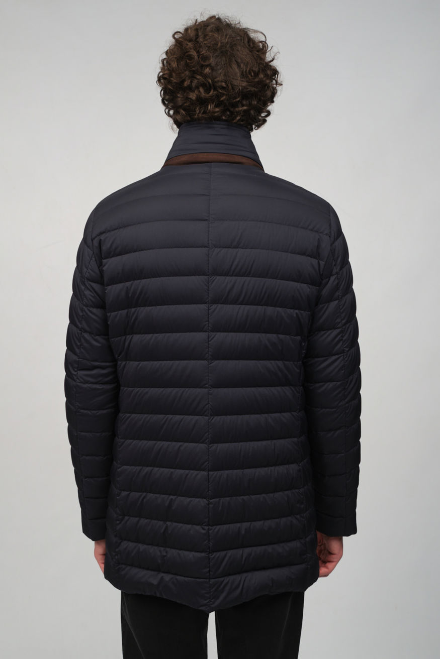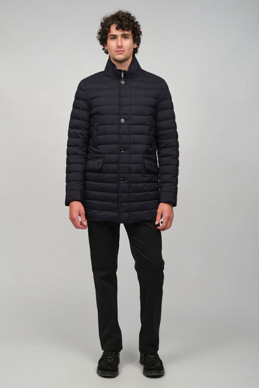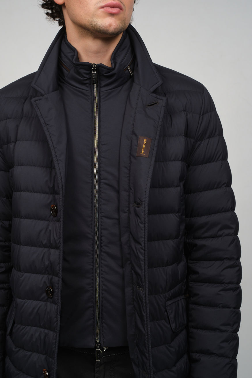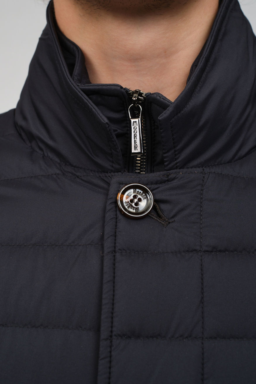 Темно-синий стеганый пуховик MOORER прямого кроя. Модель оснащена отложным воротником, прорезными карманами и застежкой на пуговицы, а также дополнена съемной нижней частью с воротником-стойкой на молнии.