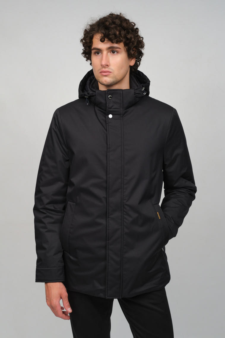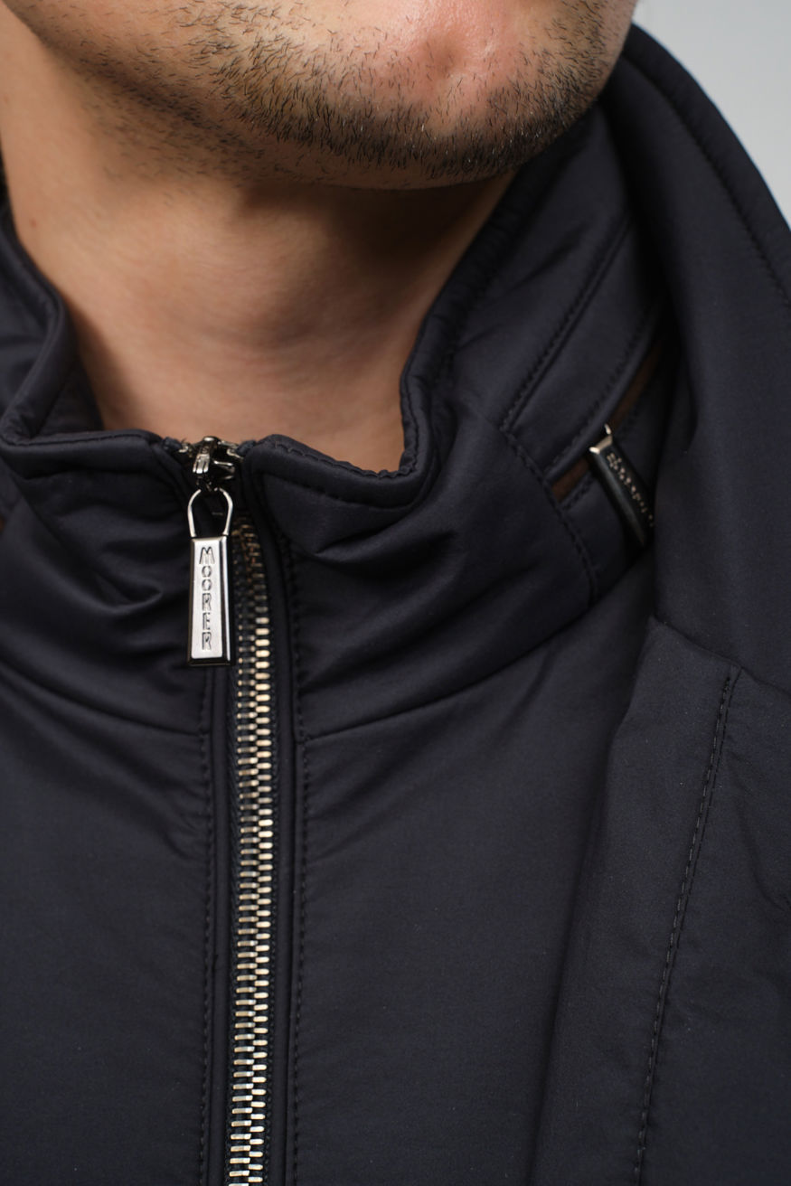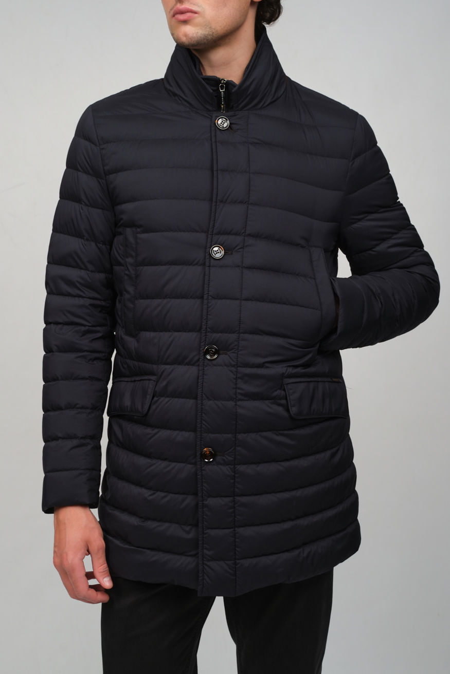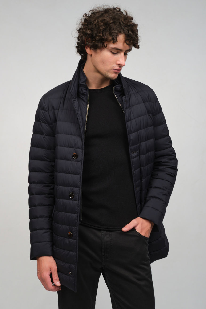 Темно-синий стеганый пуховик MOORER прямого кроя. Модель оснащена отложным воротником, прорезными карманами и застежкой на пуговицы, а также дополнена съемной нижней частью с воротником-стойкой на молнии.