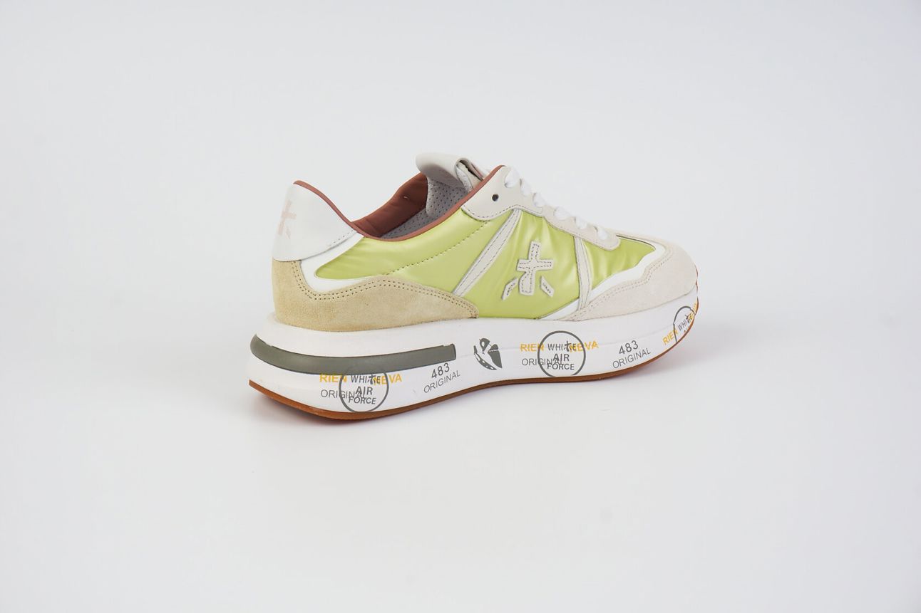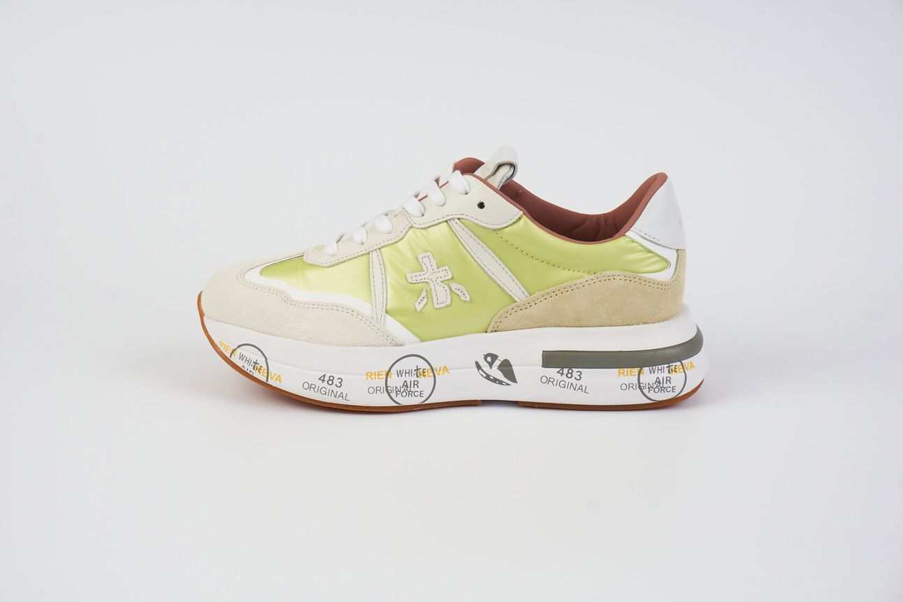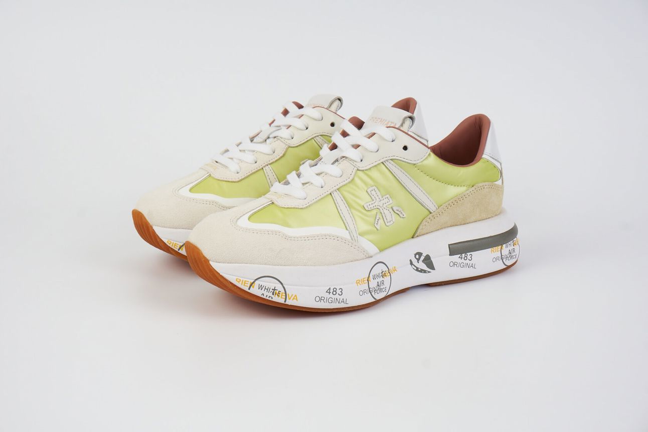 Женские кроссовки от бренда Premiata. Модель выполнена в сочетании плотной текстильной ткани лаймовогого цвета и натуральной светлой замши, внутри подклад и стелька из натуральной кожи. Резиновая подошва дополнена фирменным принтом, что делает её главным акцентом пары. Завершает дизайн фирменная монограмма сбоку.