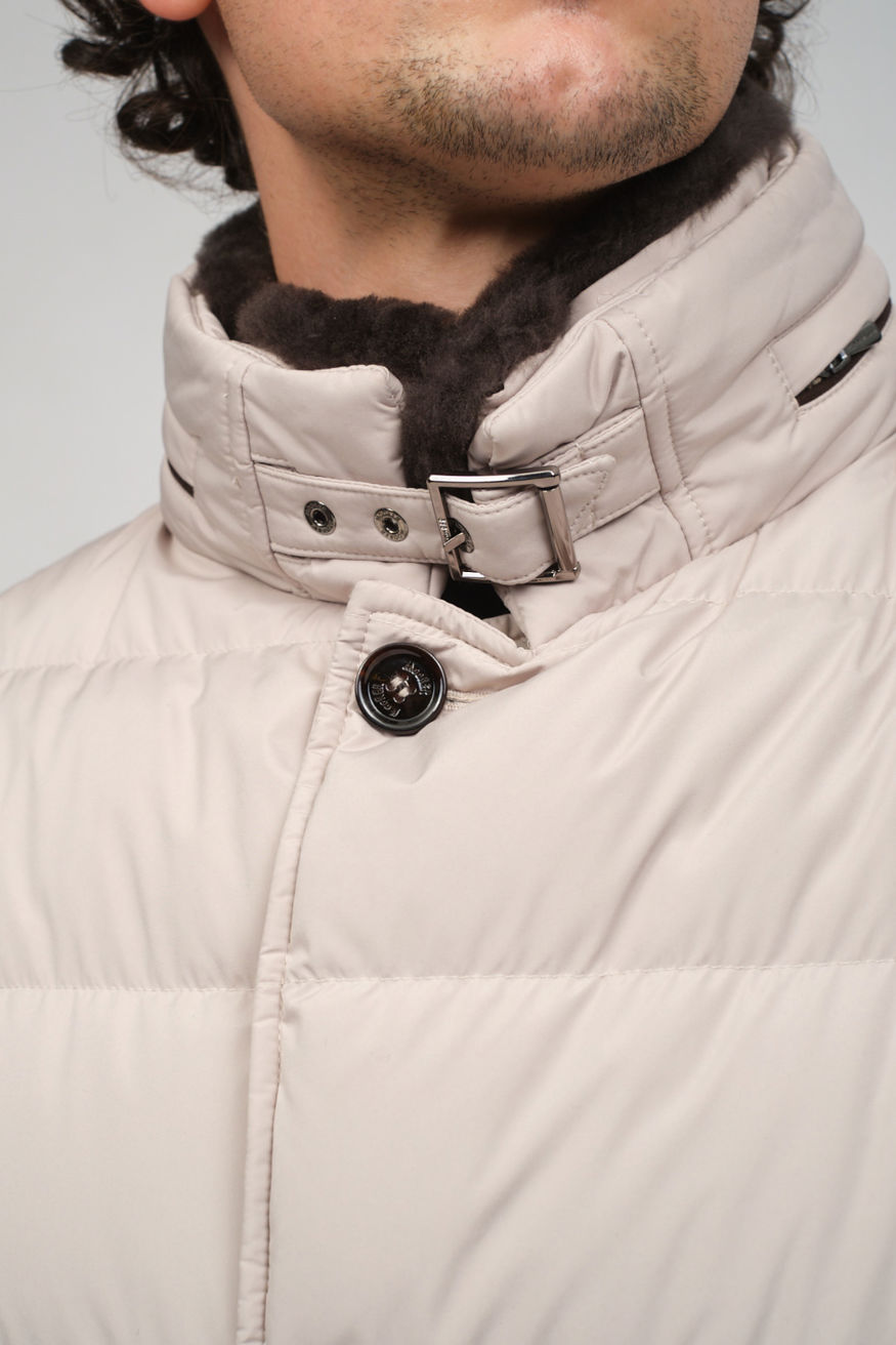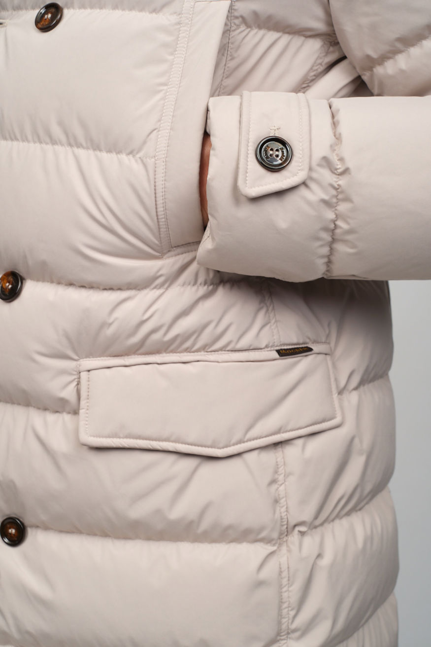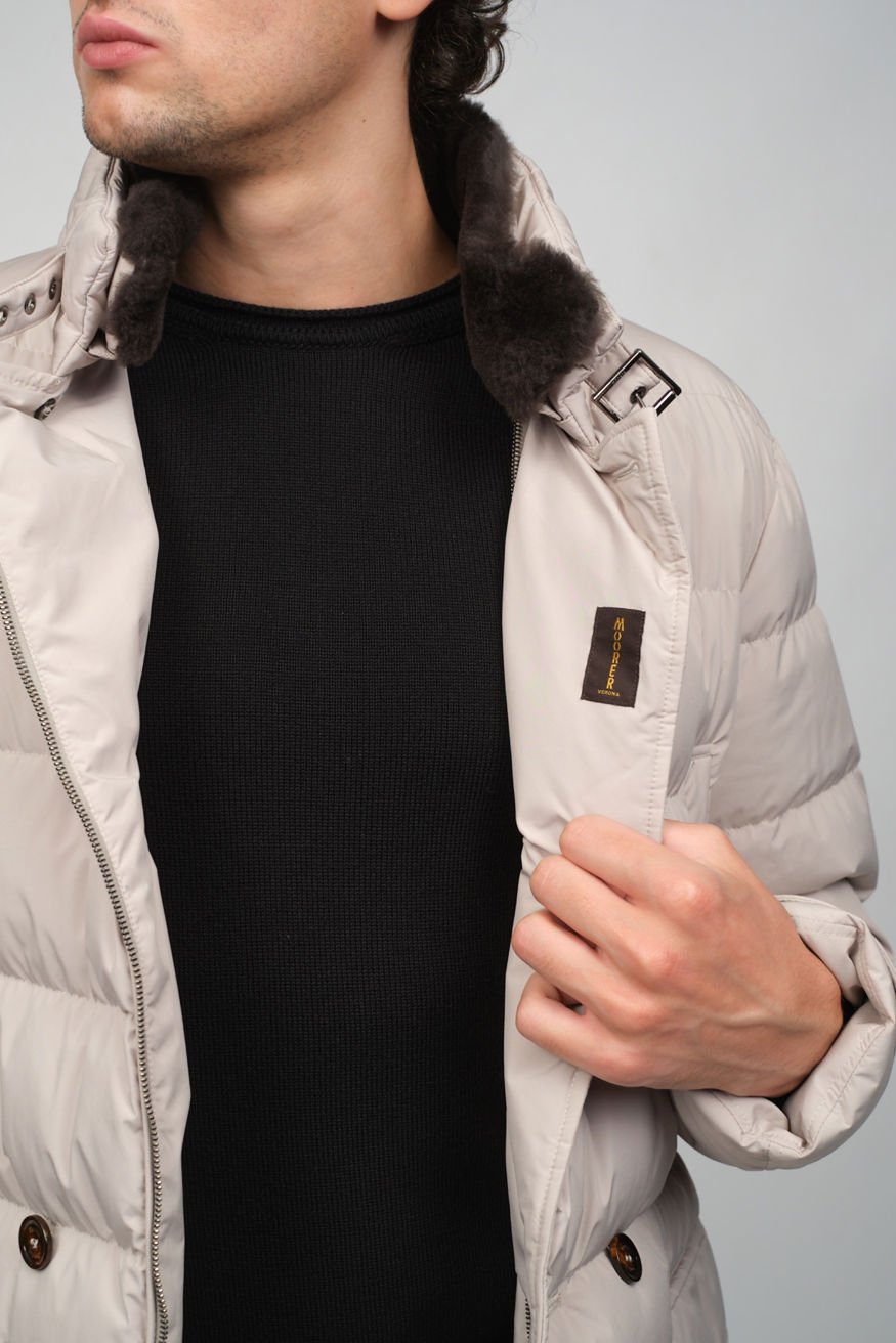 Двубортный удлиненный пуховик MOORER прямого кроя с защитой от ветра и влаги, утепленный гусиным пухом для комфорта, оснащен воротником-стойкой с отстегивающейся подкладкой из овчины. Температурный режим до -12⁰С