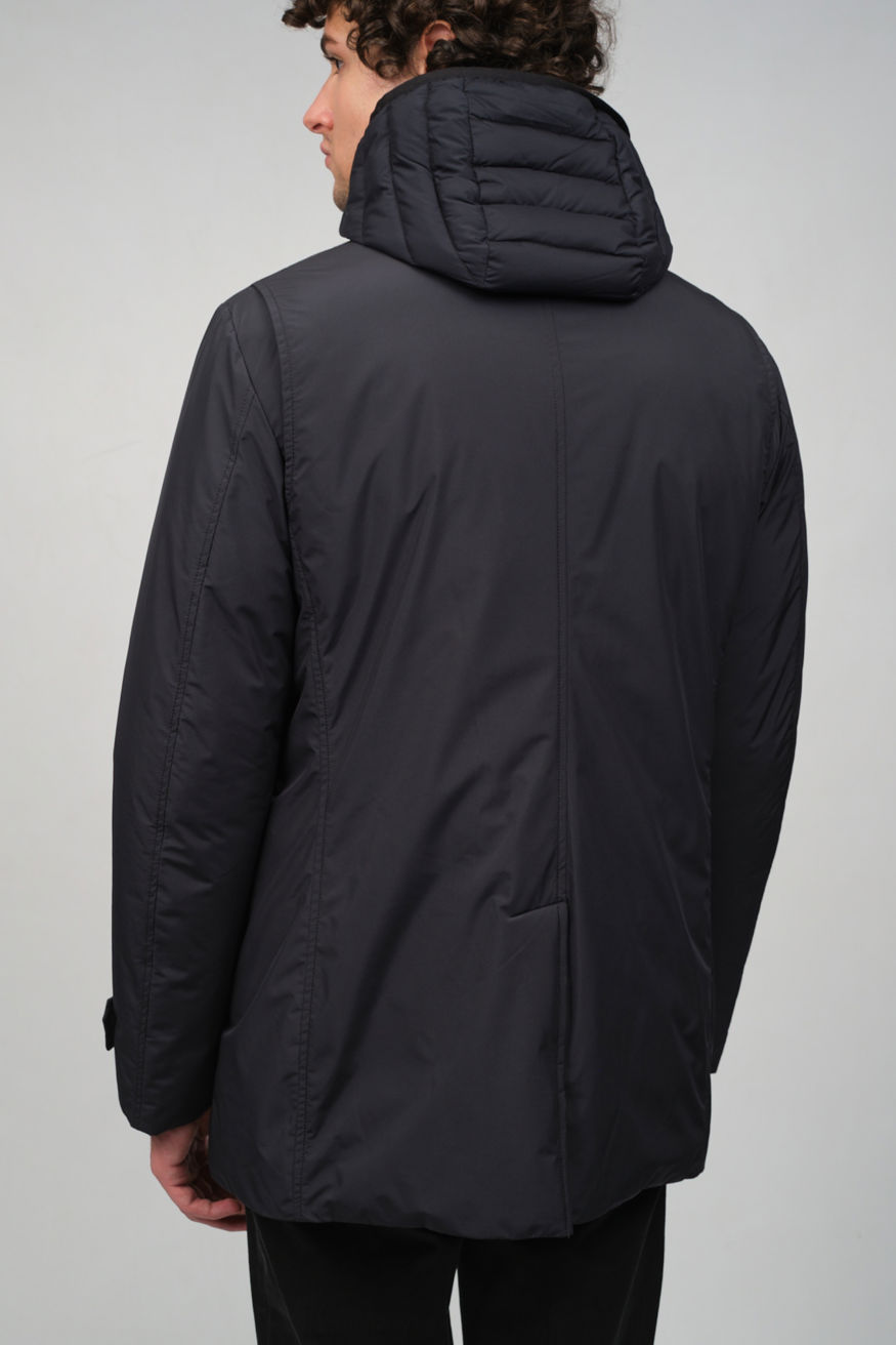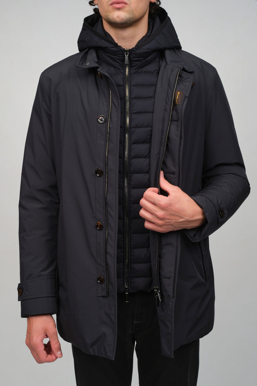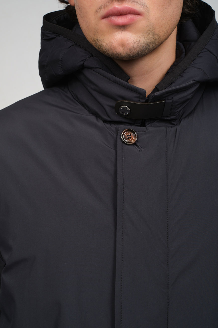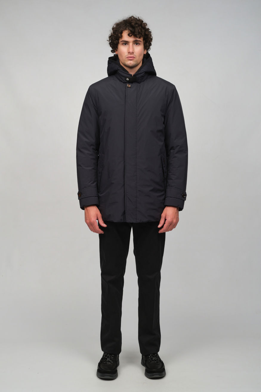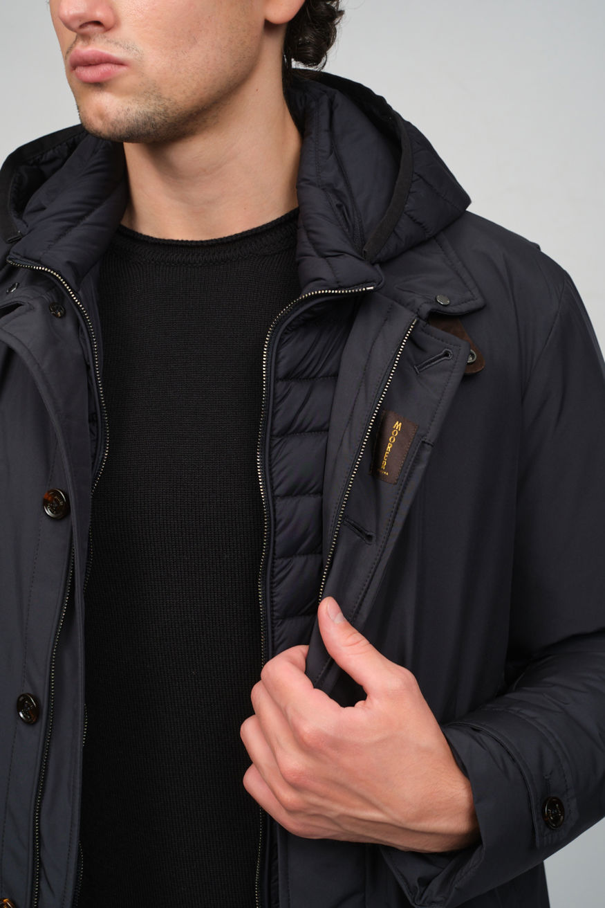 Утепленная куртка синего цвета от MOORER отличается полуприлегающим силуэтом, усиленной влагозащитой, воротником-стойкой и комплектом практичных деталей: накладные карманы,съемный капюшон, ветрозащитная планка и внутренняя кулиска.