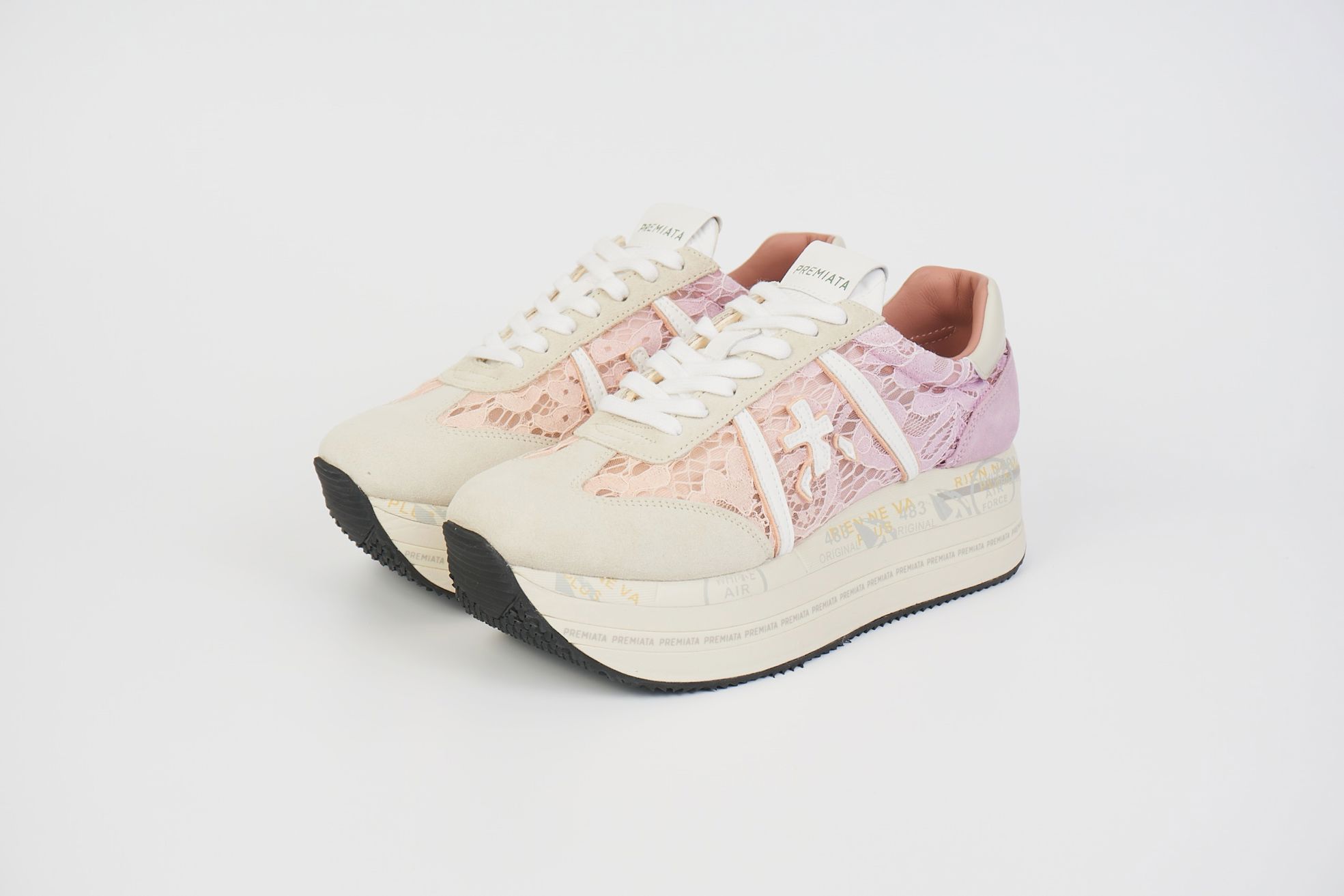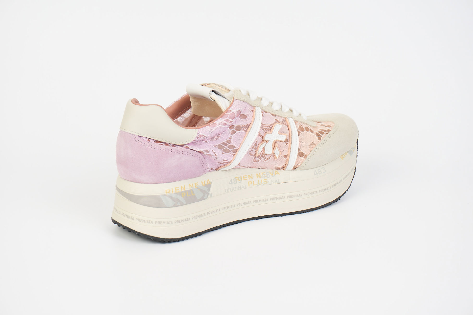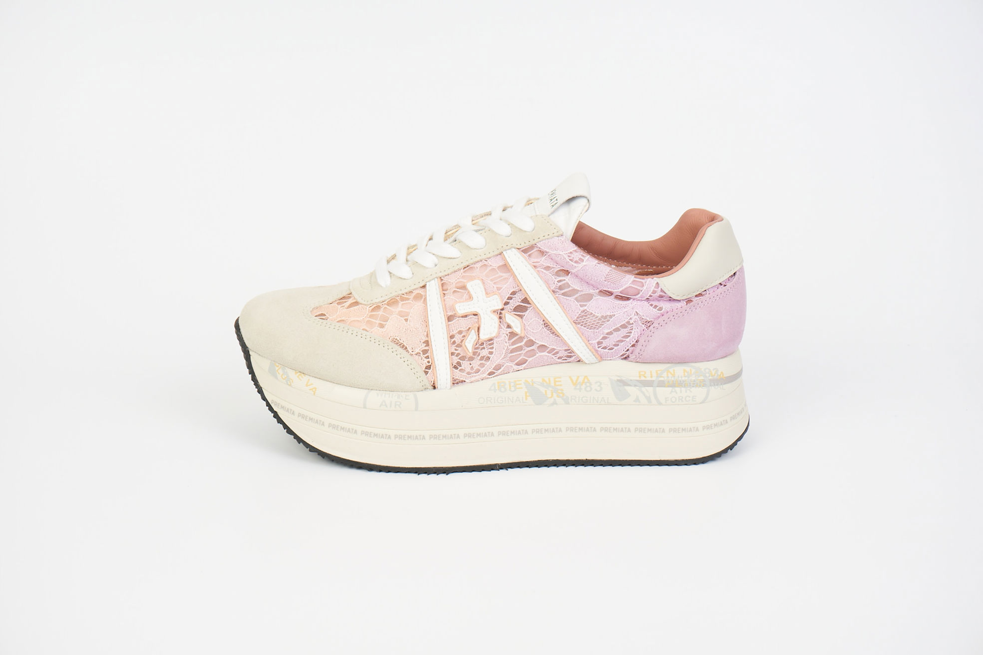 Розовые кружевные кроссовки Beth. Модель из замши и гладкой кожи на широкой полимерной подошве. Внутри оттедлка из кожи. Дизайн дополняют фирменные элементы бренда: логотип сбоку и принтованная резиновая подошва.