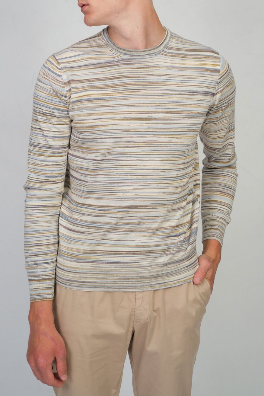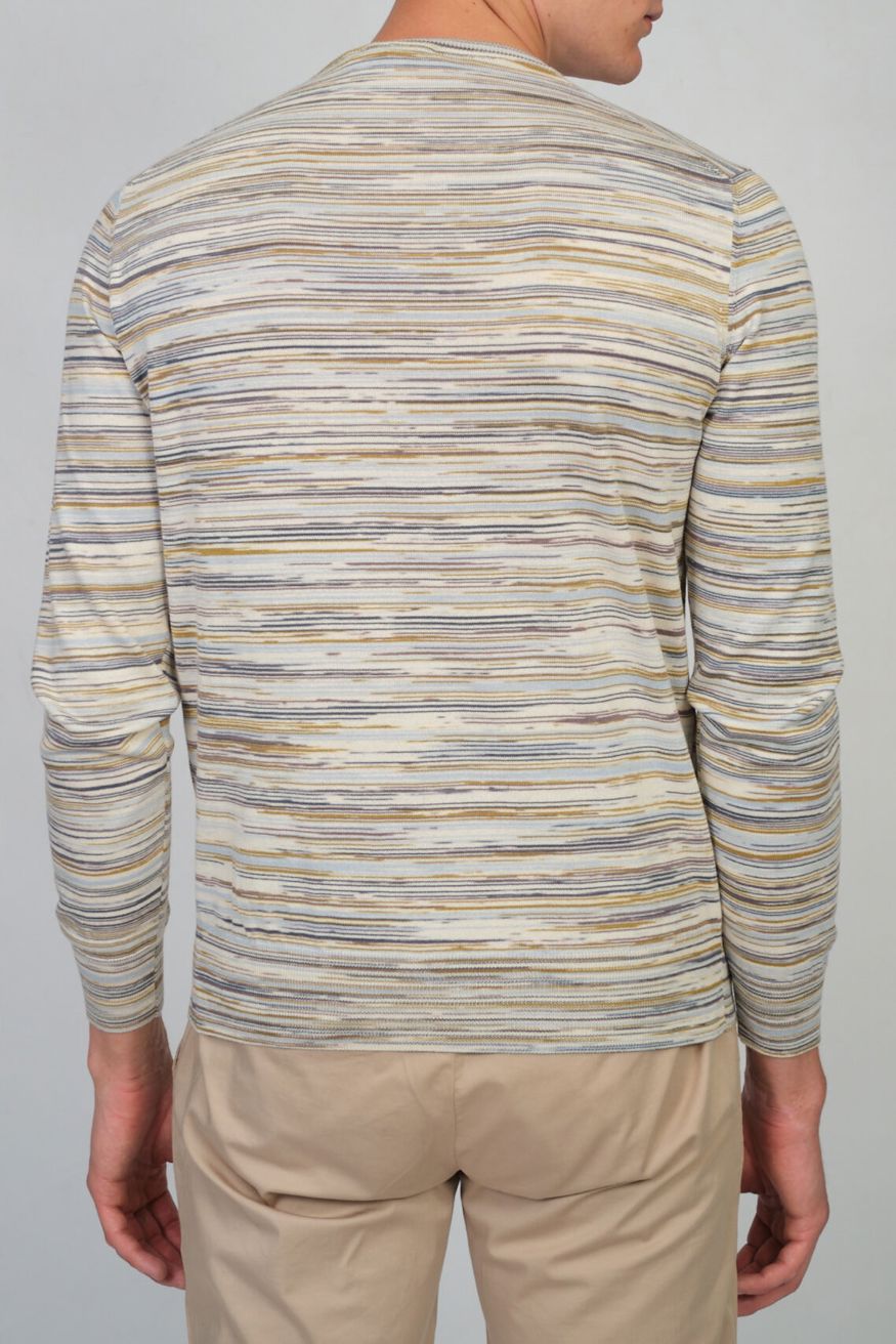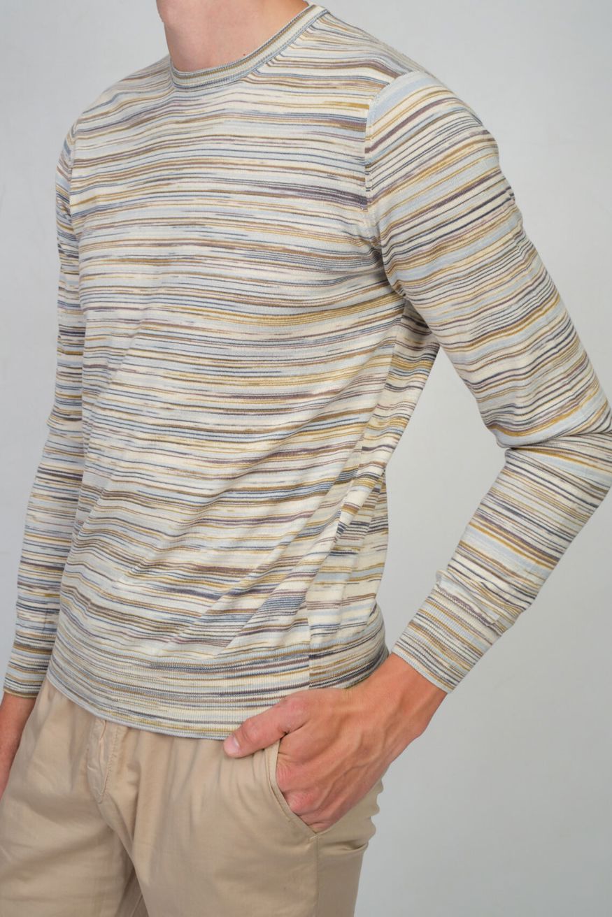 Мужской джемпер из коллекции PANICALE изготовлен из смесовой льняной пряжи. Модель с длинными рукавами и круглой горловиной. Отделка нижнего края, рукавов и горловины фактурной вязки в рубчик.