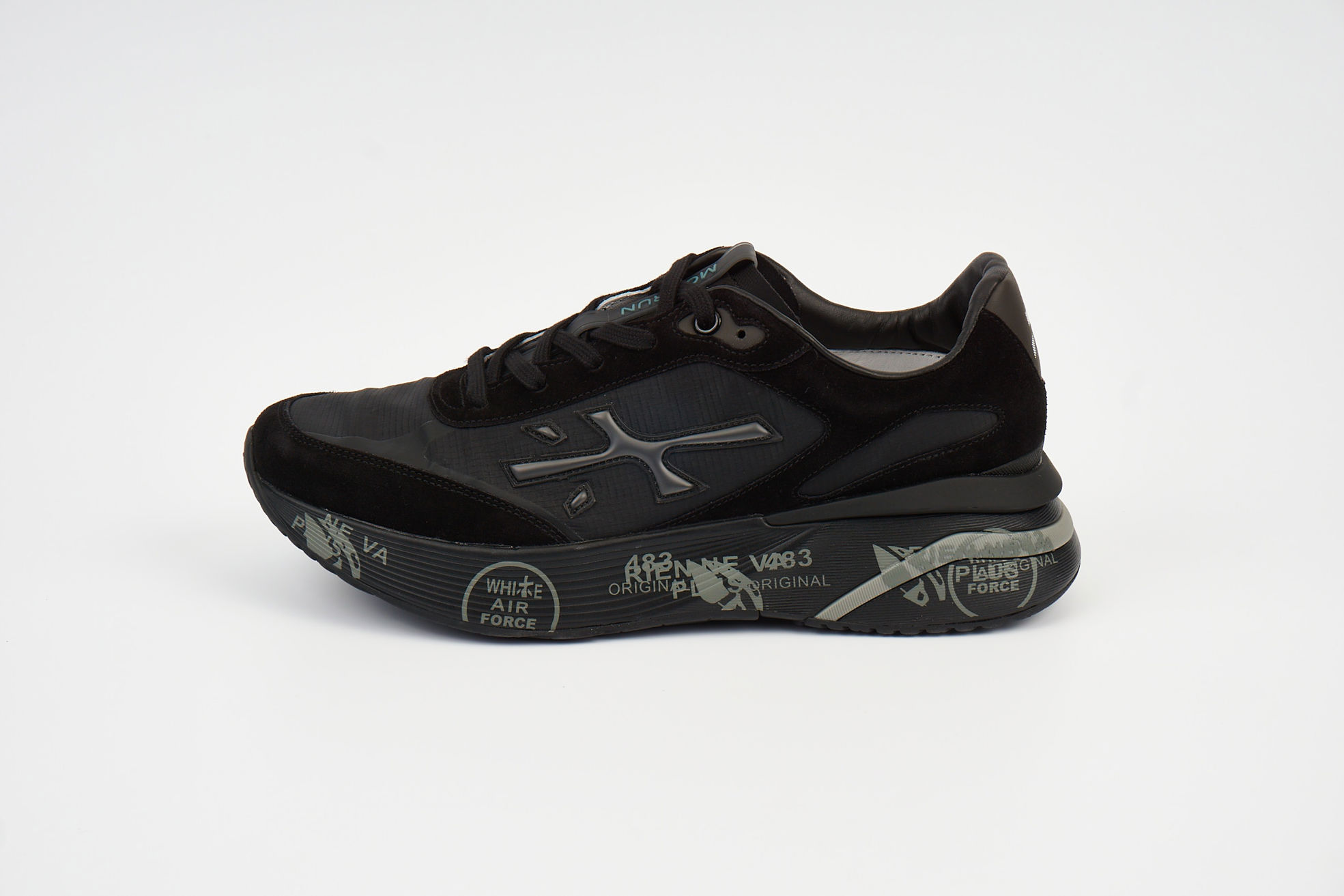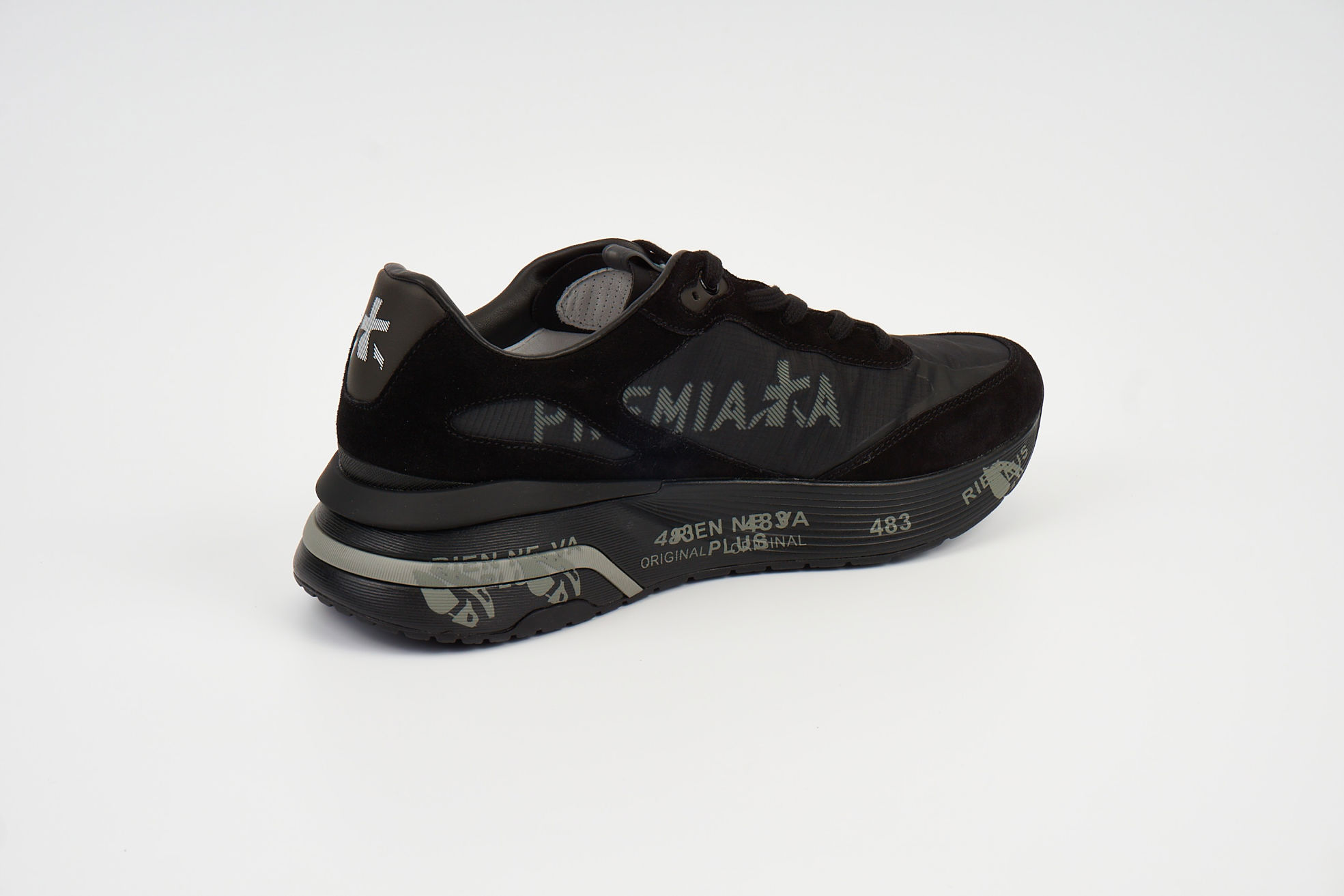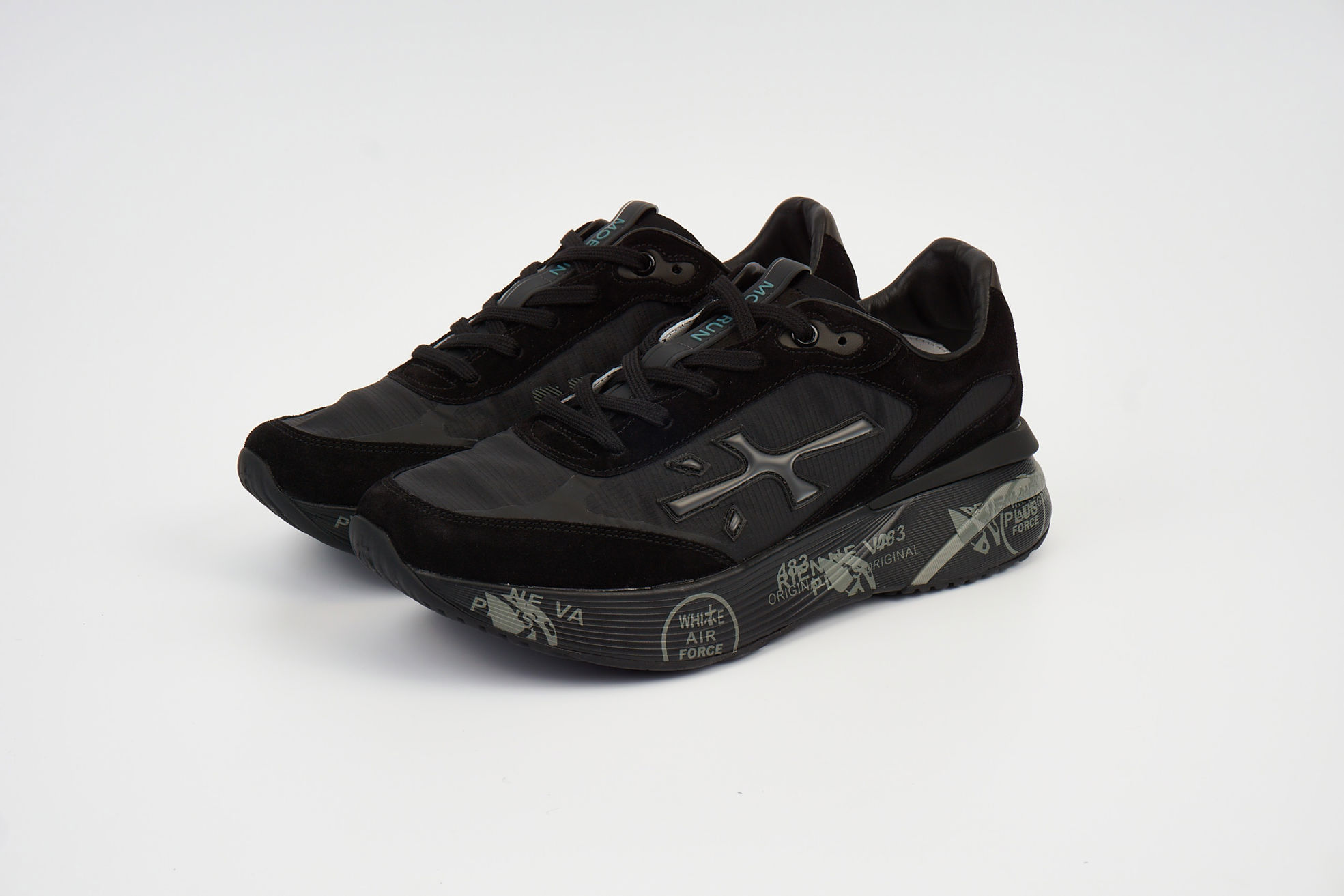 Черные кроссовки PREMIATA из комбинации текстиля и замши. Модель на толстой облегченной подошве, которая уменьшает нагрузку при ходьбе Фирменная подошва с принтом, боковая надпись и логотип. Идеально комбинируются с джинсами и спортивными брюками.