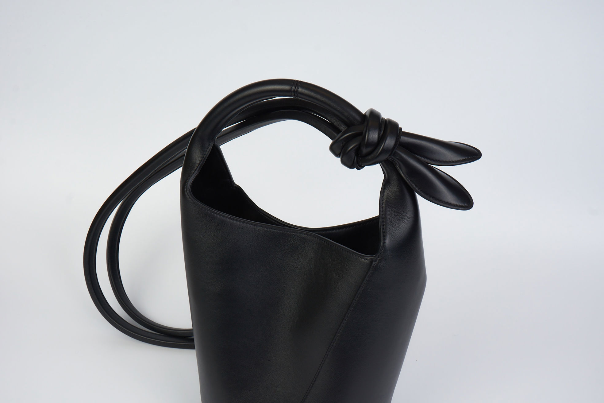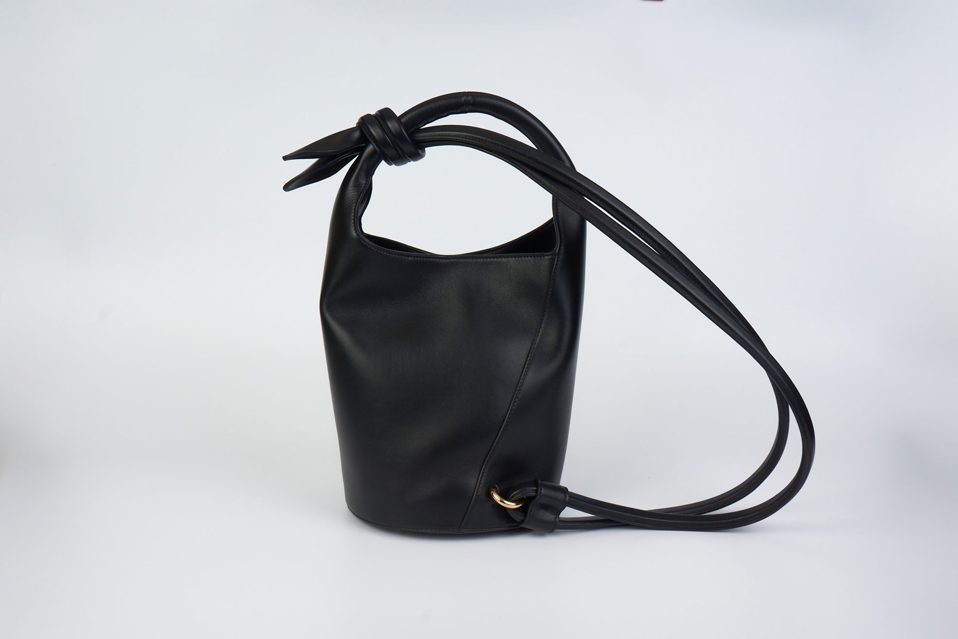 Черная сумка-ведро с завязками. Модель из кожи с хлопковым подкладом. Плечевой ремень с завязками сбоку. Украшена золотистым логотипом. Размеры 24 х 20х 30, длина ремешка 85 см